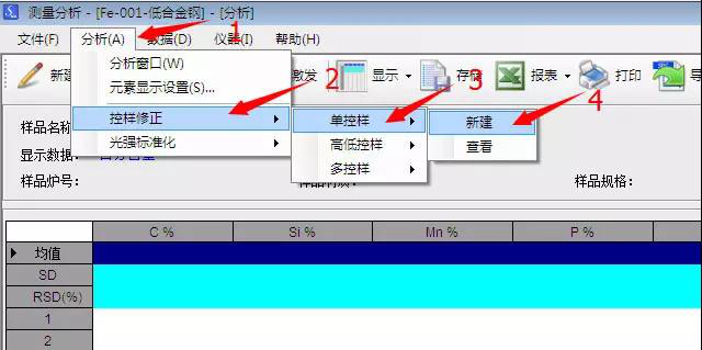 在軟件打開的界面中單擊“分析”—“控樣修正”—“單控樣”—“新建”